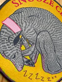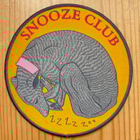 A woven fabric patch featuring a sleeping sighthound who is a fully paid up member of “Snooze club”
